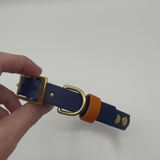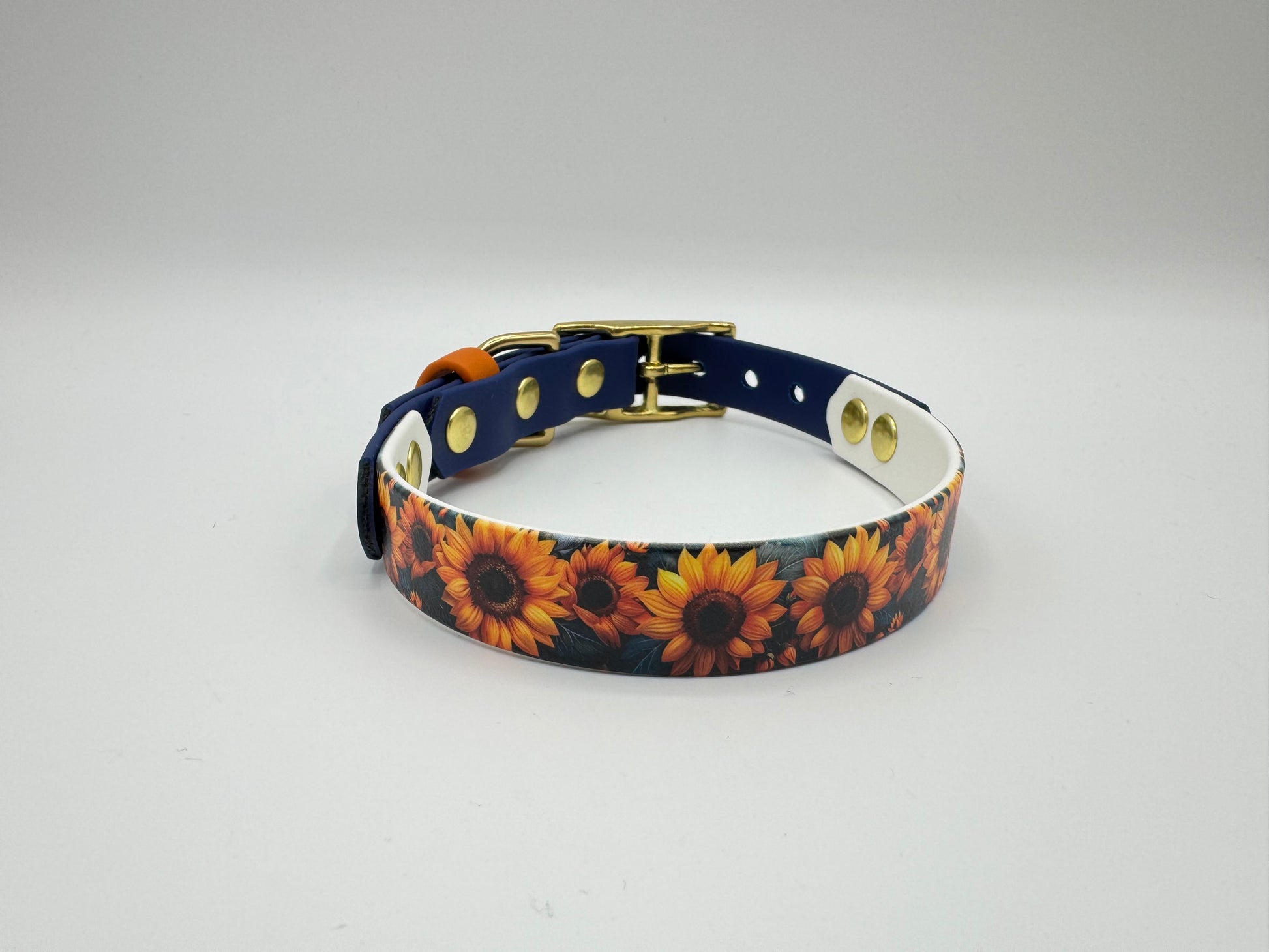 Made from 19mm UV printed Sunflower Biothane, with 19mm adjustable straps and Brass hardware.